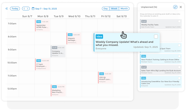 With MangoApps’ Post Planning calendar, conveniently work on your internal communications strategy from a single location. Use intuitive drag-and-drop tools to create a visual content calendar, avoid communication overload with built-in warnings, and keep track of content ideas, drafts, and published pieces. Plan, schedule, and deploy company-wide and team-specific updates—as well as emergency alerts—to keep your entire organization informed and engaged effortlessly.