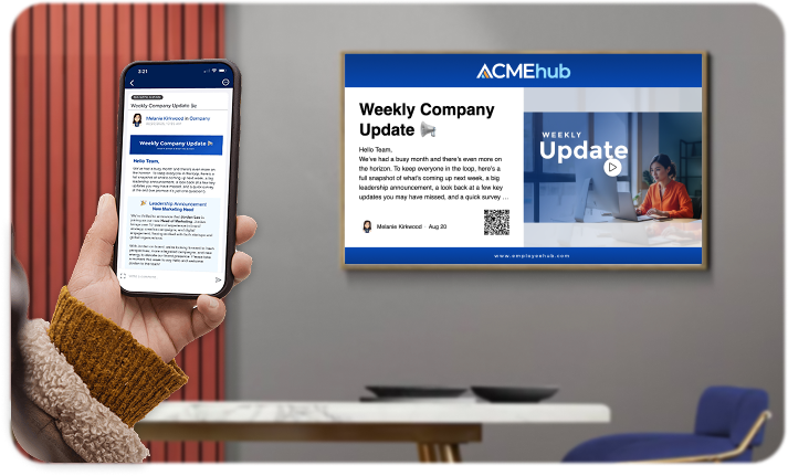 Omnichannel publishing from a centralized platform means every employee can consume content on the platform that suits them. Whether on mobile or web, employees can view up-to-date information with ease and receive notifications through their personal devices and email. Admins can also create dynamic digital signage for screens in physical locations and eye-catching announcement banners on your MangoApps site, meaning crucial company information is never missed.