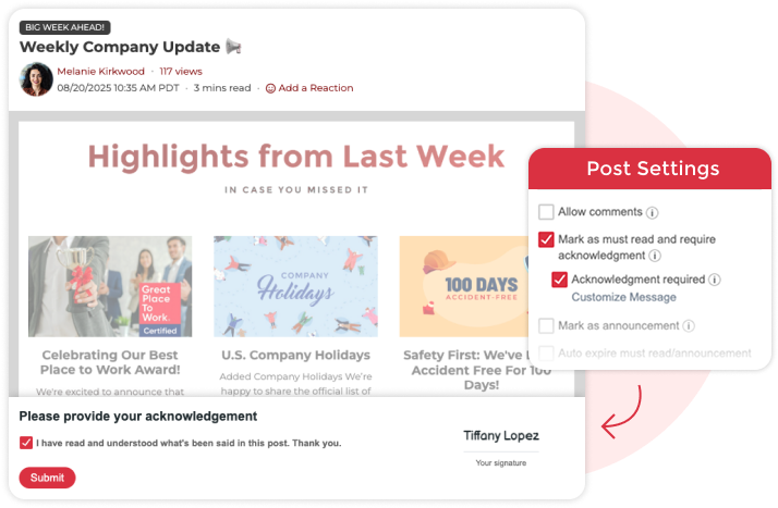 Enable company compliance and documentation by allowing authors to mandate that employees check a box acknowledging that they have read urgent communications. Admins can track who has read these crucial messages and when, ensuring an auditable record of accountability and precision with your internal communications.