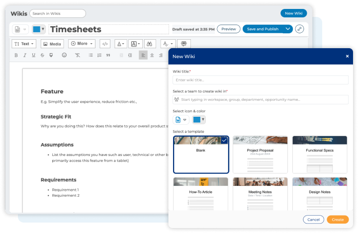 Immediately capture and store critical knowledge in Wikis that are accessible from any device, ensuring that the entire team can stay updated on the latest information. Manage who can view or contribute to Wikis by setting them as public or private, maintaining control over access and contributions to sensitive content. Select specific teams, projects, groups, or departments to share content with, keeping all relevant information centralized and easy to access.