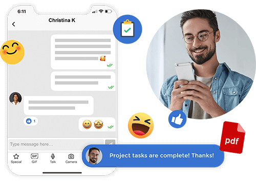Users can collaborate in real time by sending private messages directly from their mobile app to any employee, even a frontline or production worker with no email address.